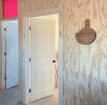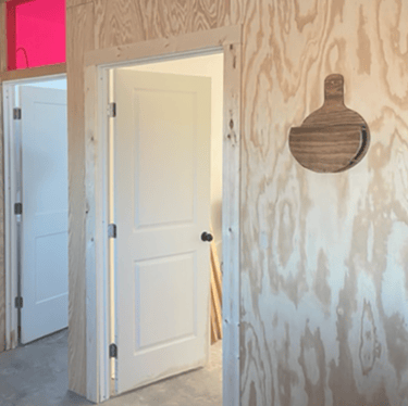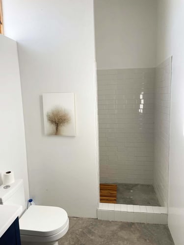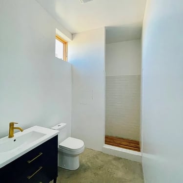 - High-ceilings, wood-clad open living area and concrete floors througout